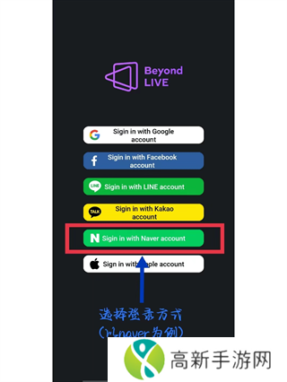 1、进入Beyond LIVE登录页面,软件共提供了多种方式进行登录,这里小编以Naver为例