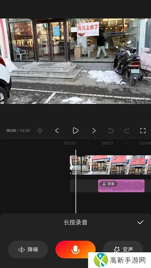 3、如果用户需要加入配音,只需要点击最下面一栏的音频,再点录音,长按就可以进行视频配音了