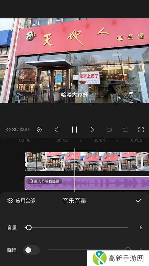 6、导入好音乐后,一般音乐声音不可以超过人的声音,我们需要将将音量调到4一8,听着适宜即可,初步剪辑视频就是这样,这些熟悉后用户就可以加上自己的水印,再制作属于自己特色的片头、片尾了。