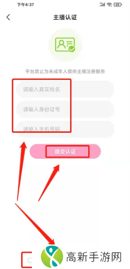 进入主播认证界面,输入真实姓名、身份证号、宋八手机号码、勾选认证协议,点击【提交认证】。
