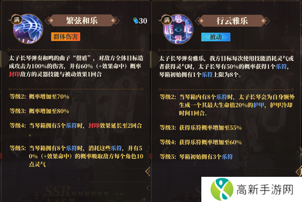 繁弦和乐:太子长琴攻击敌方全体,概率封印敌方目标的灵器技能与被动技能,升级增加封印基础概率,消耗30灵气;4级技能延长封印回合,5级技能概率吸收敌方灵气,是两个提升显著的技能等级。