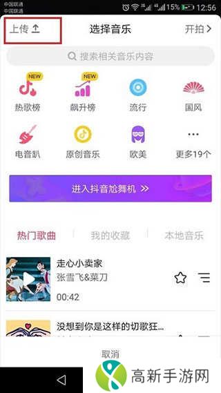 2、第二步进去选择音乐界面之后,点击左上方的“上传”;
