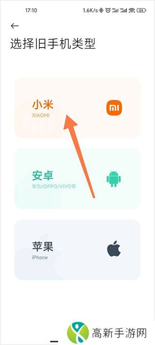3、在旧手机类型中选择【小米】,根据旧手机的手机类型选择;