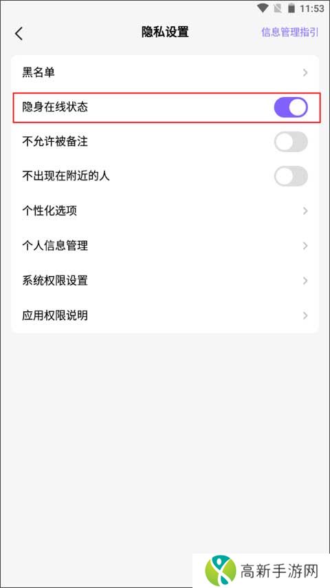 5、在隐私设置界面点击“隐身在线状态”后面的圆点