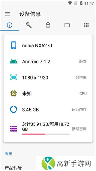 2、轻松获取设备信息,包括设备型号、CPU信息、运行内存、存储空间、屏幕信息、网络连接、电池信息等。