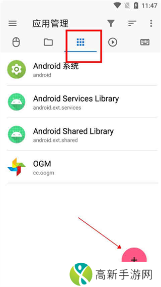 4、上方选项栏点至应用,右下角+号安装应用,选择手机中提前下载好的apk。