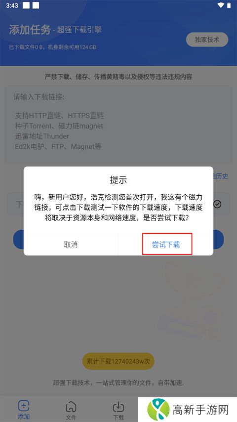 1、打开app之后会有一个磁力链接供你测试,点击右下角的尝试下载。