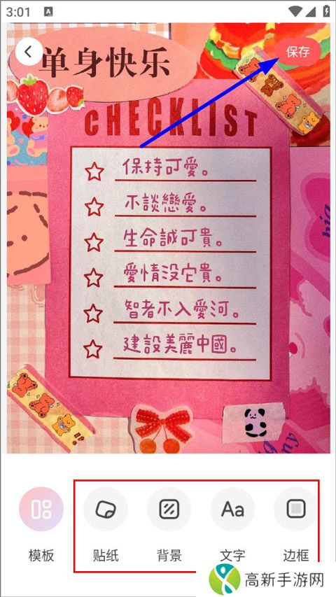 5、添加添加贴纸、背景、文字、边框等,点击右上角保存即可完成手账。