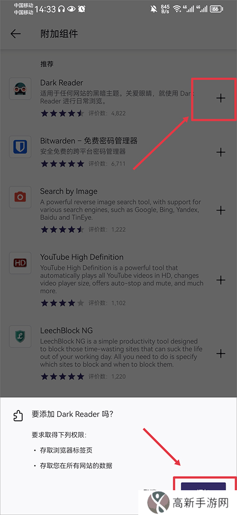 3、然后在附加组件界面中选择你要添加的插件,点击右边+号按键,并点击添加