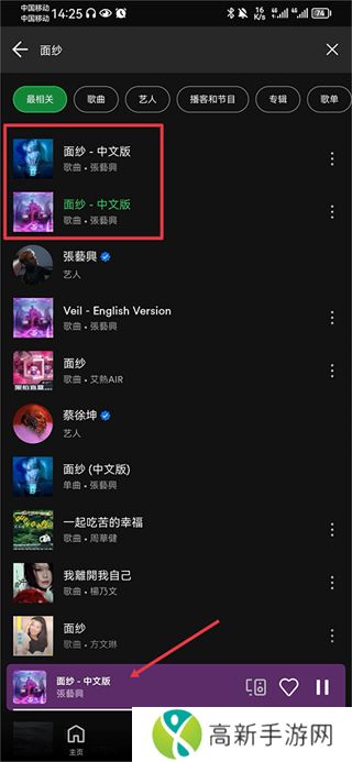 2、这里小编以面纱为例子进行搜索,搜索结果出来后点击你收听的歌曲,播放后点击下方的歌曲进入播放界面;