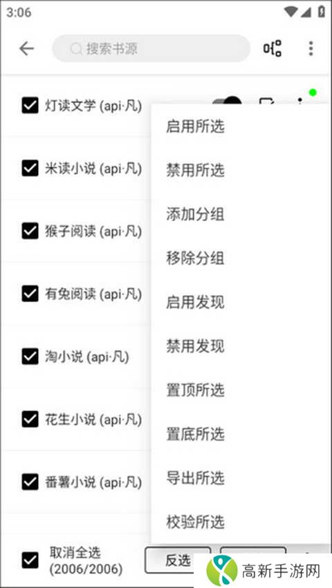 10、返回书源界面,可看到目前书源总共为2006条了,勾选相应的书源后选择右下角【三个点】图标,点击【启用所选】即可阅读喜欢的书籍了,以上就是程序猿小说的用法。