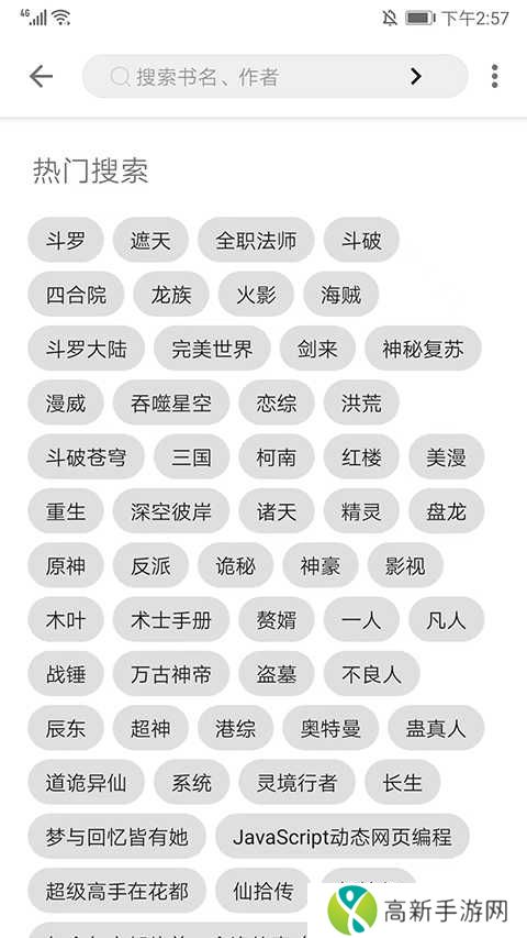 2、进入书架栏目,我们可以通过右上角搜索书名或者作者以及选择下方的热门搜索来添加喜欢的小说,