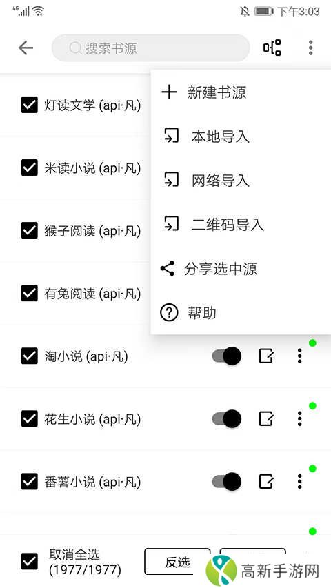 6、进入书源界面,可看到目前有1977条书源,勾选后即可启用,我们选择右上角【三个点】图标,可进行导入书源的操作,包括新建书源、本地导入、网络导入、二维码导入等方式,