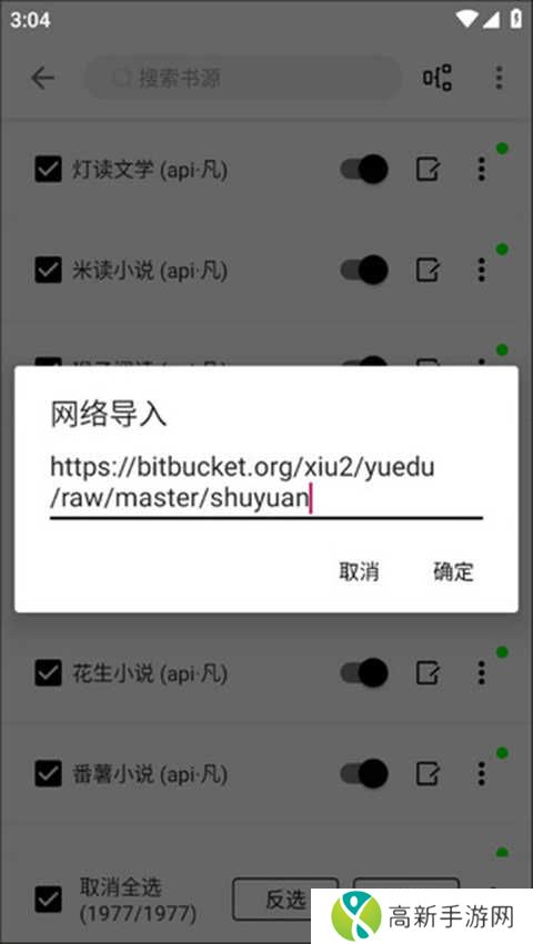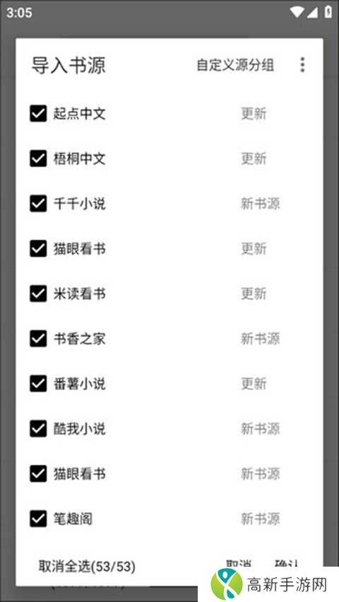 9、如图,可看到新增的导入书源信息,我们全部勾选后选择右下角【确认】选项,