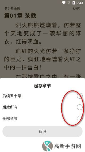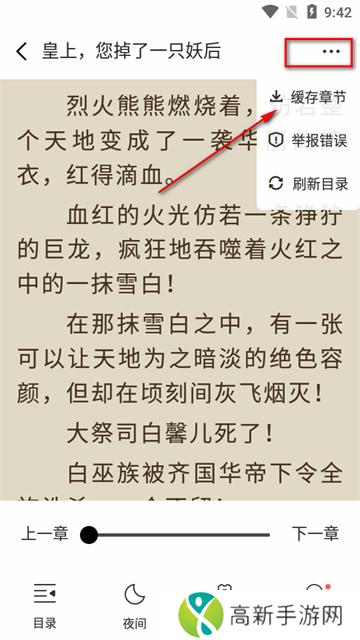 5、来到阅读页面,点右上角三个点,选择缓存章节。