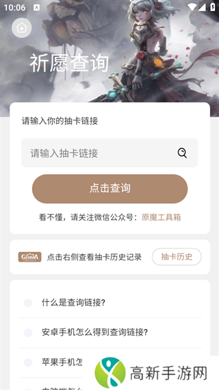 3、在主页点击抽卡查询,进入抽卡查询界面;抽卡链接可以选择原魔工具箱公众号的教程,但是小编更推荐使用原神link进行获取,本站即可搜索下载;