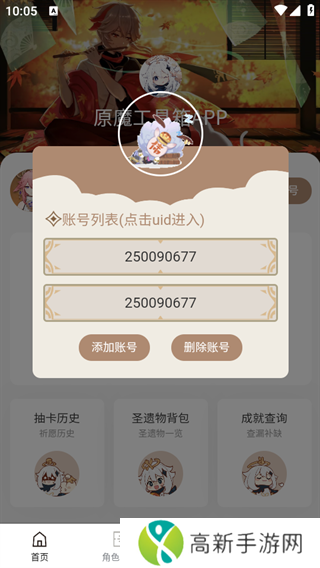2、点击添加账号,输入自己的原神UID即可,然后返回主页;