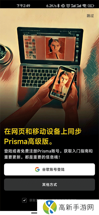 Prisma如何制作出一个漂亮的艺术作品1、打开软件后进入到登录界面,用谷歌账号进行登录,如果你没有账号,可以点击右上角先跳过。