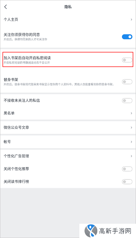 3、在隐私界面点击“私密阅读”右侧的开关即可进行设置啦,还可以通过设置“替身书架”来提升你的阅读体验!
