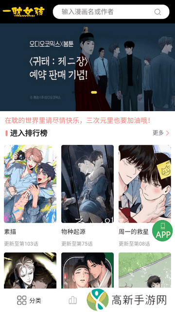 一耽漫画,为大家带来了超多好看的原耽漫画,你可以看到不一样的特色恋爱,超多帅哥等着你来发掘。每天都有不同的资源更新,让你可以开心的追漫,超过上万本完结漫画可以免费观看阅读。
