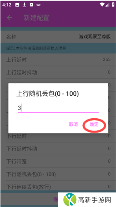 5、自已设置好名称,上行延时,上行随机丢包参数等,点击“确定”。