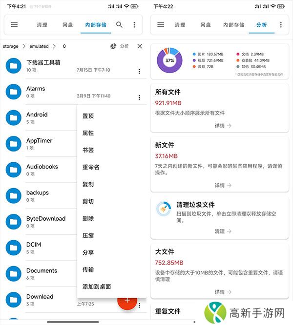 支持分析内部存储,清理空文件、空文件夹、日志文件、临时文件、缓存文件、冗余文件、重复文件、大文件,释放存储空间,还可以查看文件夹大小及占用比例。