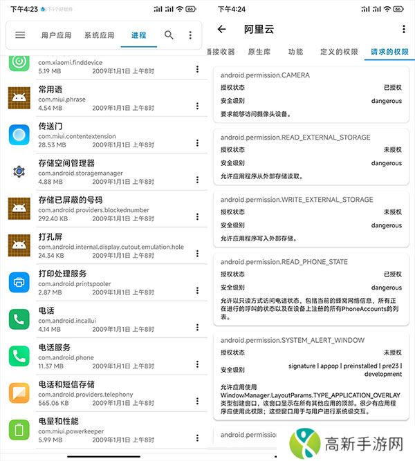 6、查看系统进程、系统应用、用户应用,可以非常详细的了解到每个应用的信息,包括包名称、版本号、SDK、进程名、APK路径、证书、服务、权限、原生库等等……以及可以对应用进行备份。