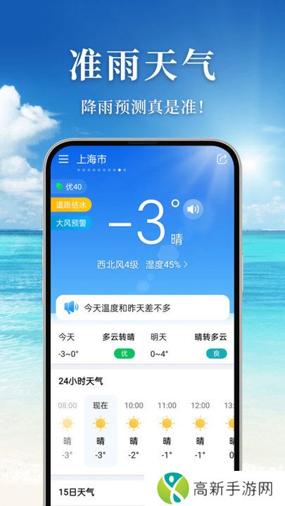 2、轻松查看未来24小时的天气,包括温度变化,帮助您应对早晚的巨大温差。