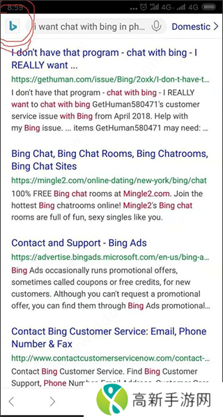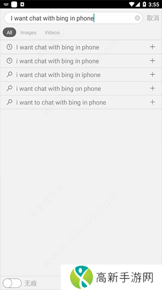 2.在输入框中输入“ I want chat with bing in phone", 手机上输入其他的文字不会调出 AI对话机器人,只有简单的搜索功能。