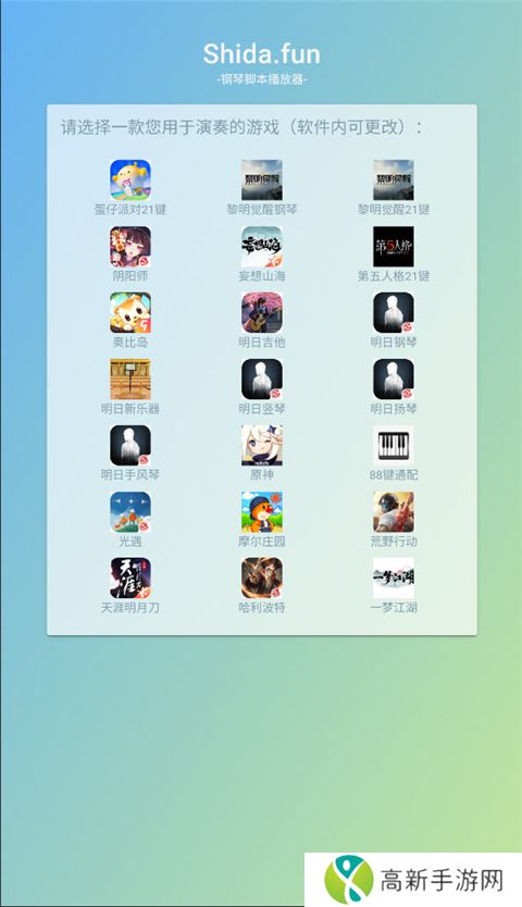 1、下载安装好Shida钢琴助手,初次打开软件会跳转到选择游戏界面,在该界面选中您用于演奏的游戏乐器就可以了(后续可以在软件内更改),这里小编以原神为例子;