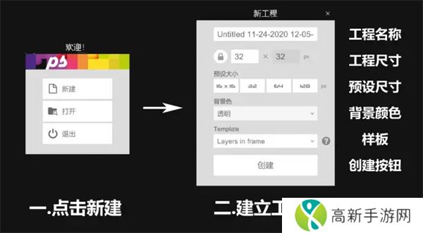 2、第一次打开软件会出现左侧的新建窗口,然后我们点击新建就会弹出右侧的建立工程。从上到下一次能够设置工程名称、画布尺寸(普通版最大储存为1024*1024)、预设尺寸(系统提供好的)、设置背景板的颜色、“template”是样板的意思,其中设置好了动画样板、图层样板和基础字体(这个设置好之后会出现96帧动画,没啥用)。设置好之后,我们就可以点击“创建“开始我们的绘画了。