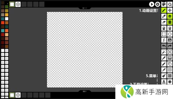 3、如果把图层和动画功能打开,我们会发现有四个设置:动画栏右侧的动画设置、菜单按钮左侧的工具设置、图层栏右侧的图层设置、工具栏最下方的软件设置。记得要到对应的工具设置中寻找想要的功能。比如说我想要删除图层们就要去图层设置中找,我想要调整动画速度,我就要去动画设置里找。