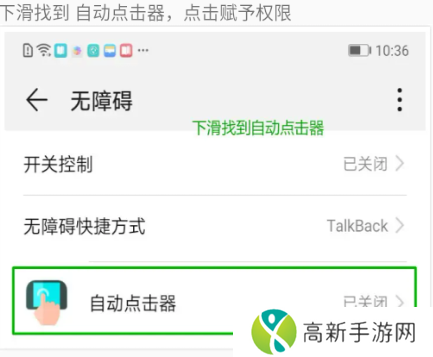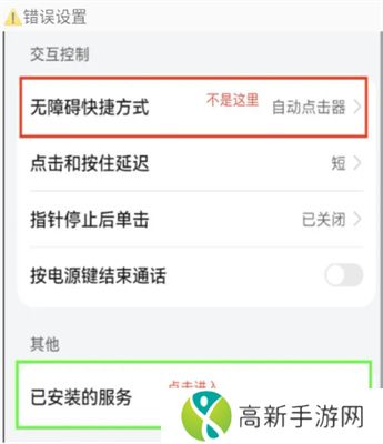 注意可能出现的错误设置,部分用户设置了红框中的快捷设置,这是错误的,应该是绿色方框中寻找自动点击器进行权限设置;