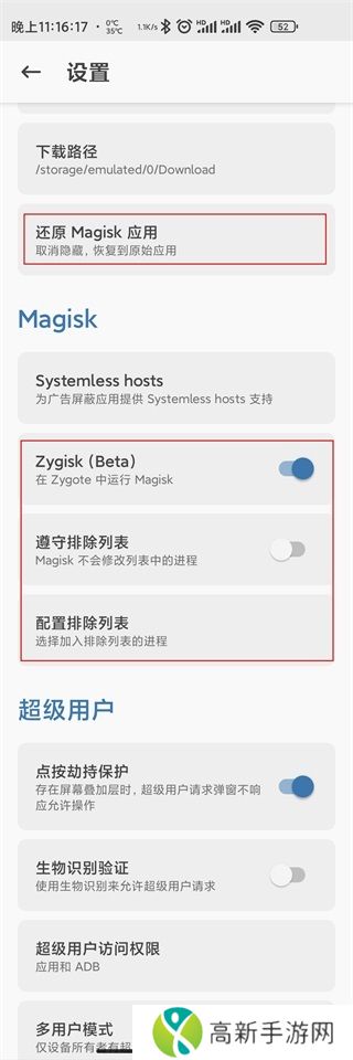 我们可以看到第一个红框里面,Magisk已经被隐藏了。然后进入第二个红框部分,开启Zygisk,先选择遵守协议列表,然后进入配置排除列表,把所有需要对其隐藏的App都选中,用法跟原来的Magisk Hide是一样的。确定列表后,再把遵守协议列表的选项关闭,因为我们已经安装了Shamiko,所以现在的状态就是列表生效但是并没有被排除,达到了我们预计的目的。