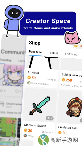 6.玩家互动:无需编程,游戏机制可以通过简单的块编码创建。您还可以设计虚拟资产,与其他创作者互动,并结交全球朋友。