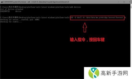 10、当手机设备出来之后,输入“.adb -d shell sh /data/data/me.piebridge.brevent/brevent.sh”完成授权。