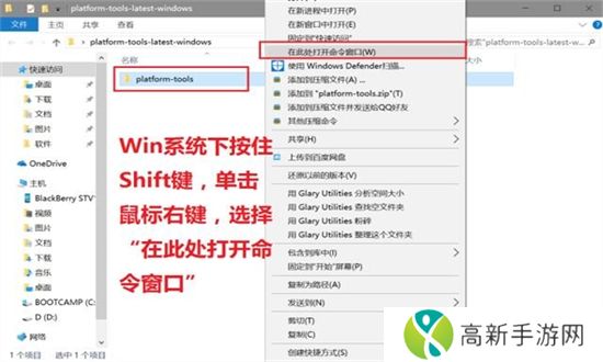 8、打开电脑中的ADB文件,按住shift键,然后右键点击空白处,找到在此处打开命令窗口。