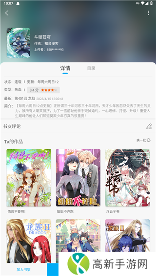 2、找到想要看的漫画和小说之后一键添加到书架即可,当然也可以在线免费阅读和先缓存之后再离线阅读;