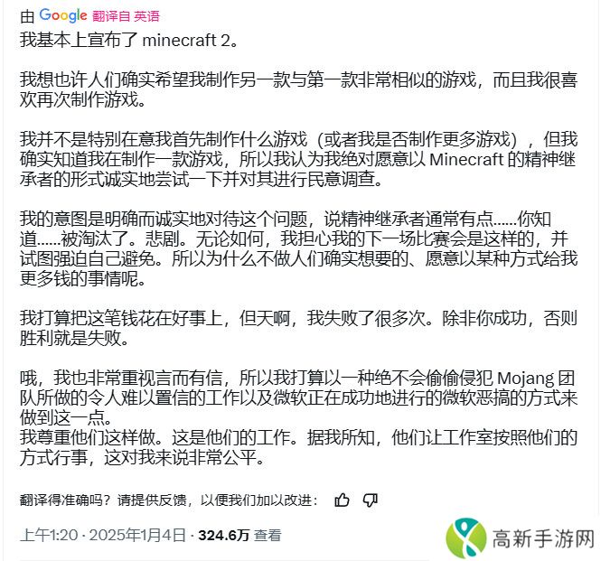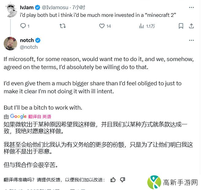 Notch是否真的会制作他那款类似《我的世界2》的精神续作仍有待观察,但他似乎很清楚,如果这是观众想要的,他就会去做。