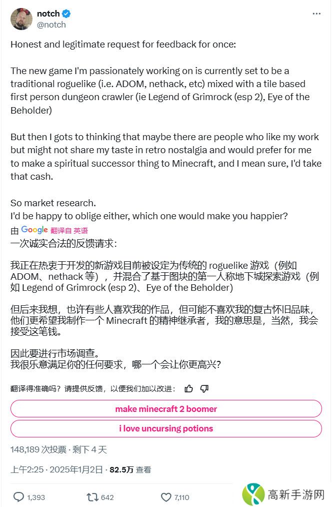 这位《我的世界》创造者在其个人X上询问粉丝,他们希望他在下一个游戏中怎么做,是开发《我的世界2》还是继续他所描述的“传统肉鸽游戏+基于砖瓦的第一人称地牢挖掘游戏”: