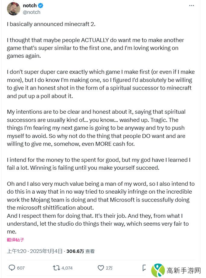 在一个社交媒体(X)的帖子中,Markus "Notch" Persson 吊足了粉丝的胃口,暗示了一款潜在的《我的世界》精神续作,他暂且称之为《我的世界2》。