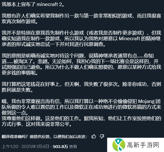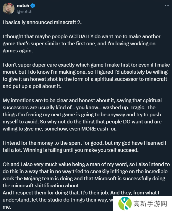 消息的源头来自“notch”于1月2日在X平台上发布的一条动态。他在该动态中表示,自己正着手开发一款全新的游戏。起初,他考虑的是制作一款传统的地下城探索类肉鸽游戏。但鉴于广大玩家对《我的世界2》的期待之声愈发高涨,他决定向玩家们征集意见,再做定夺。