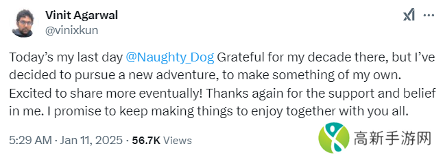 Vinit Agarwal在顽皮狗工作了10年,参与了《最后的生还者2》《神秘海域:失落的遗产》《神秘海域4》等游戏的开发工作。他没有说明离开顽皮狗的原因,以及接下来的去向。