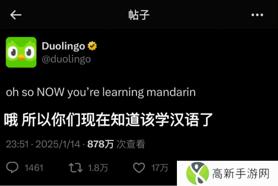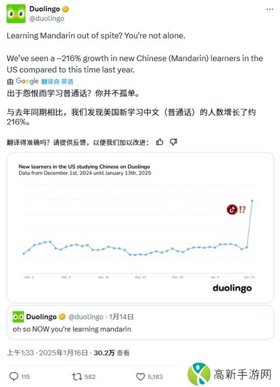 多邻国称,在自家平台,与去年同期相比,我们发现美国新学习中文(普通话)的人数增长了约 216%。