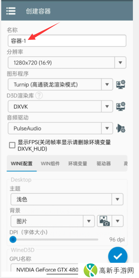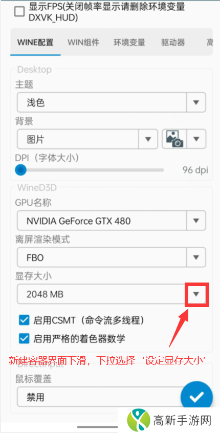 6、新建容器界面下滑,下拉选择‘设定显存大小’(建议手机配置较低的玩家,可以将显存调小);