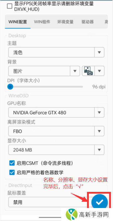 7、名称、屏幕分辨率、显存设置完毕后点击“√”;