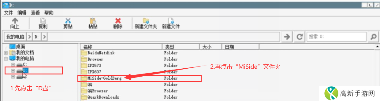 9、先点击D盘,再点击“MiSide-GoldBerg”文件夹(滑动屏幕使鼠标移动到相应的位置后双击屏幕);