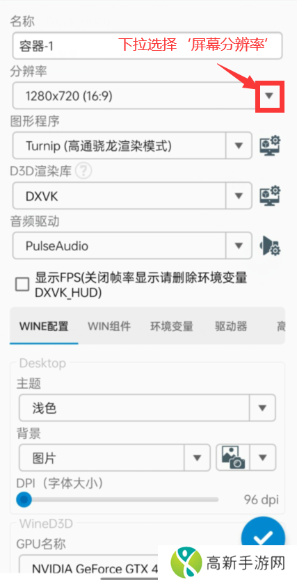 5、下拉选择“屏幕分辨率”(建议手机配置较低的玩家,可以将分辨率调小);
