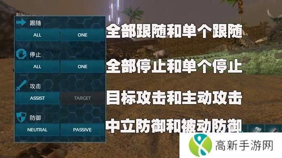 攻击:目标攻击,攻击你选择的目标,驯服后默认选择的,恐龙没像咱们这么聪明,它攻击都是不死不休的,所以经常会出现不听指挥情况,主动攻击就是四处搞事情,开启后看到动物就扑上去,口哨是不能控制主动攻击的,你需要对着恐龙打开右上角的恐龙图标,选择TARGET选项,它才会主动攻击。
