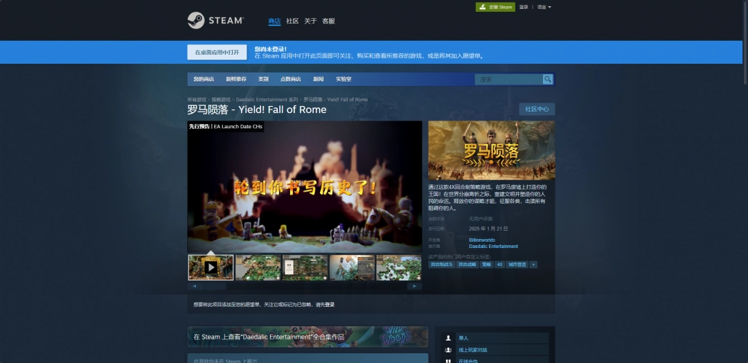 Steam平台需要先安装Steam平台,之后注册一个账号登录,然后搜索“罗马陨落 - Yield! Fall of Rome”进入商店购买页面。